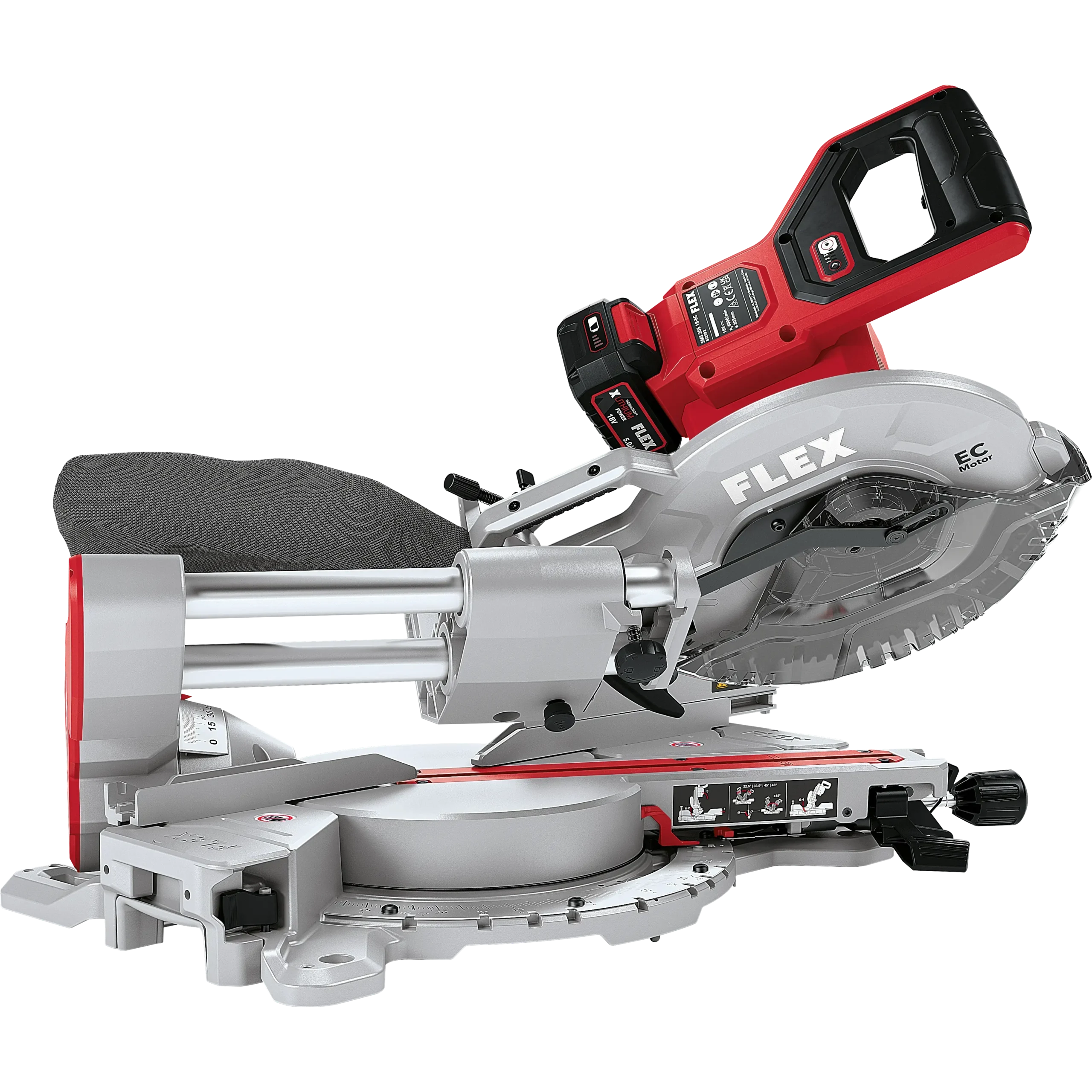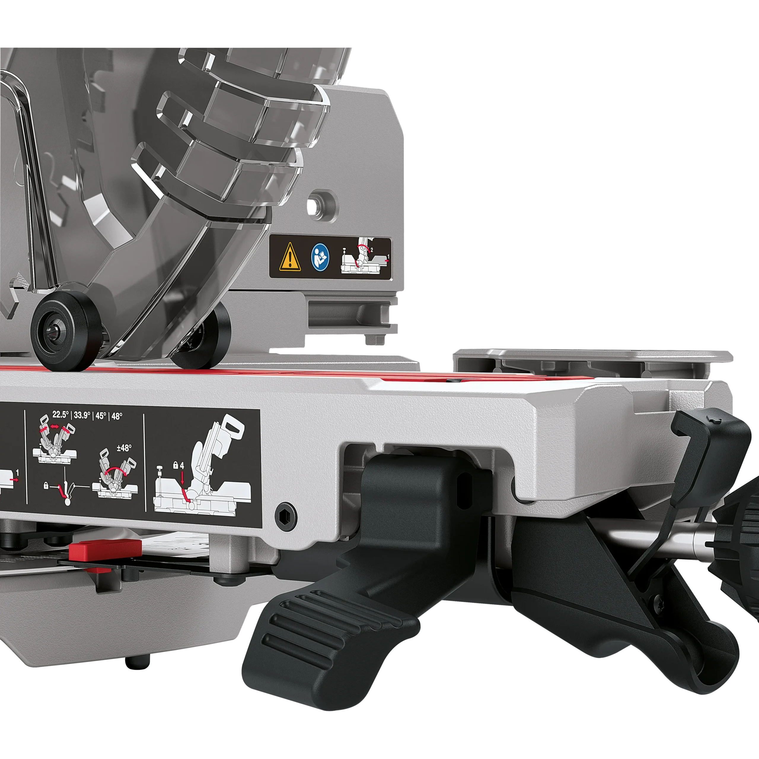• Segmento orientabile fino a 48° SD. Con arresto per angoli a 0°, 22,5°, 33,9°, 45° SD per rientranze, tagli angolati e tagli a doppia angolazione